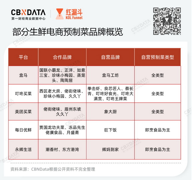 另一种就是平台品牌自营。在预制菜风口来临的当下,品牌自营成为生鲜电商的热门选择。据CBNData统计,几大头部生鲜电商平台目前都有自营的预制菜品牌。