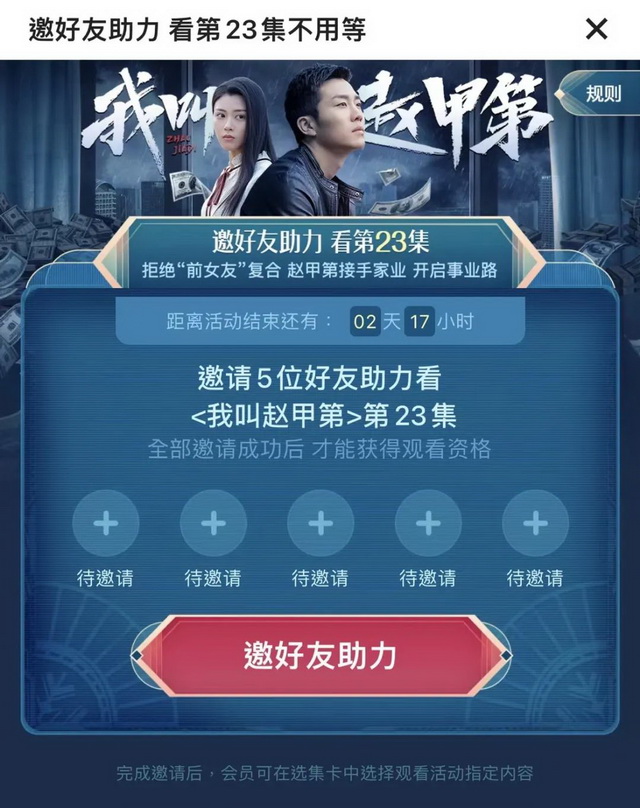 具体来说,优酷正在热播的《我叫赵甲第》的第23、24集开启了一项活动,用户可以通过“邀请好友助力”活动,提前解锁这两集的更新。由于形式、页面与电商的“邀请好友”类活动颇为相似,“优酷VIP看剧也要好友助力”成为人们讨论的话题。一时间,路人不解,营销号嘲讽,也引发了中消协的关注。