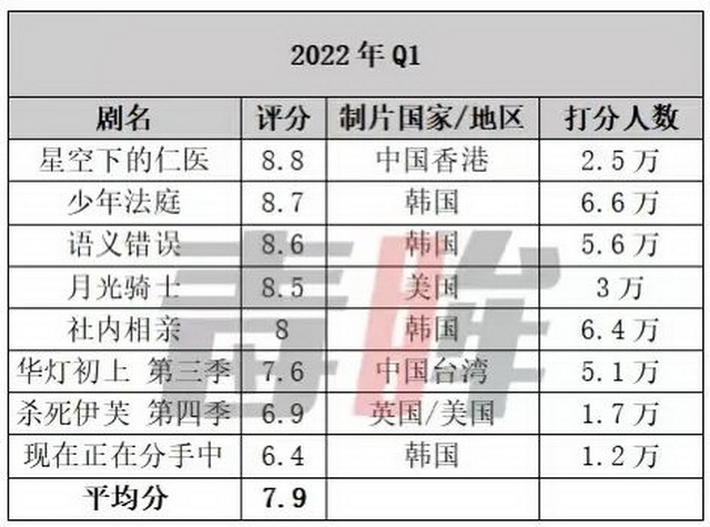 另外,海外剧的打分人数偏少,也是造成其评分普遍高于国产剧的原因,今年Q1评分前十的海外剧中,只有《少年法庭》和《社内相亲》的打分人数超过了6万。