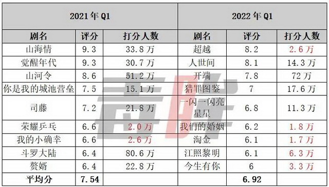 也正因如此,豆瓣评分的一丁点儿趋势,都会被发现。在今年第一季度上新的剧里,没有一部超过9分,最高的是冬奥题材剧《超越》,也只开出8.2分,打分人数不足3万,相比于去年有《山海情》和《觉醒年代》“镇场子”的Q1,今年到目前为止播出的剧在评分上,显得有些不够看了。