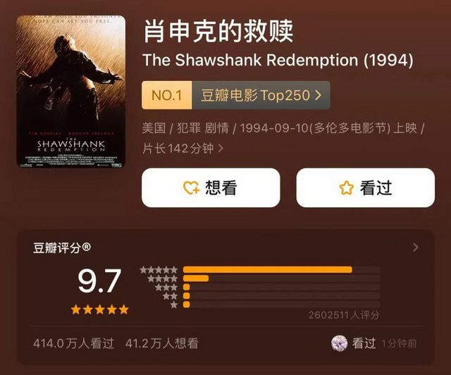 善用书影音功能的,是早期被打上“文艺青年”标签的豆瓣核心用户,电影TOP250中以9.7分位列第一的《肖申克的救赎》,能够获得213万用户打分。而热衷看国产剧、喜欢为国产剧打分的用户,不少是随着娱乐类豆瓣小组的崛起而涌入的。