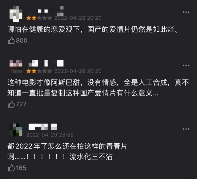 令人不明就里的是,影片至今豆瓣仍未开分。打开豆瓣短评,排名前列的热评留下了疑惑,“真不知道一直批量复制这种国产爱情片有什么意义...”