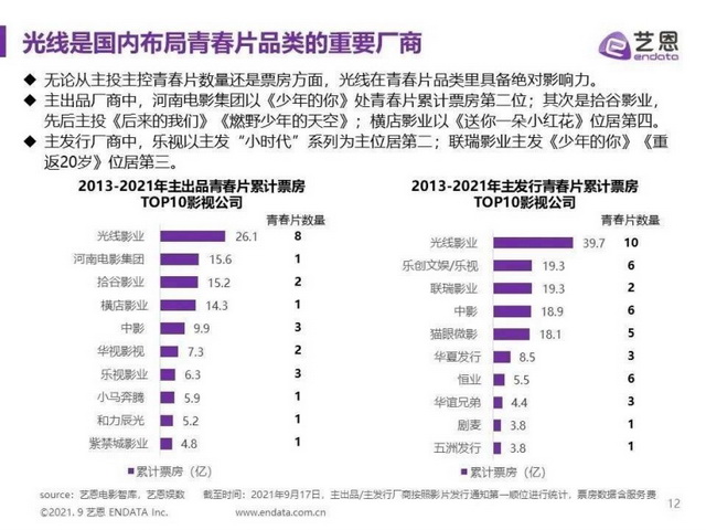 青春片的风口,光线本就是造风者。2013年,由光线影业出品的《致我们终将逝去的青春》(以下简称《致青春》)上映,席卷7.19亿票房,成为当年年度票房第三。自此之后,国产青春片迎来井喷,光线也陆续推出了《匆匆那年》《同桌的你》《左耳》等影片,均取得了4.5亿以上的票房。据艺恩《2021国产青春片类型研究报告》显示,自2013年至今,光线无论从数量还是票房上来看,都是国内布局青春片领域绝对的头部厂商。