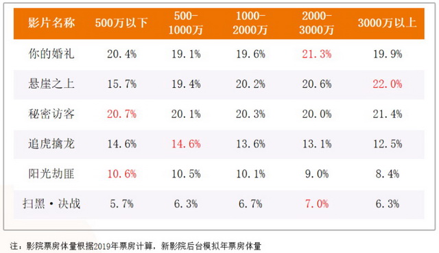 而当青春片的观影主力人群向下沉市场转移,光线的优势便得以发挥。根据拓普数据整理的去年五一档映前发行争场比例可以看出,光线为《你的婚礼》在年票房体量500万以下的影院争取了更多的场次,而3000万以上的影院却不如竞争对手,侧重点明显。
