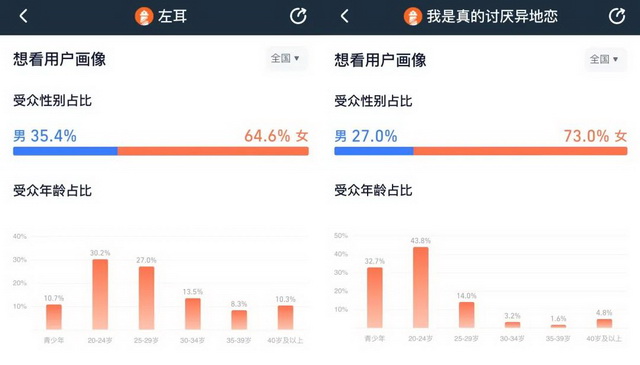 以2015年上映的《左耳》和刚刚上映的《我是真的讨厌异地恋》作对比,根据灯塔专业版的想看人群画像显示,二者的女性用户占比分别为64.6%和73%;24岁以下用户占比分别为66.4%和76.5%;三线及三线以下城市占比为33.6%和46.3%。女性、学生党、下沉市场,几乎每个维度都有约十个百分比的上升幅度。