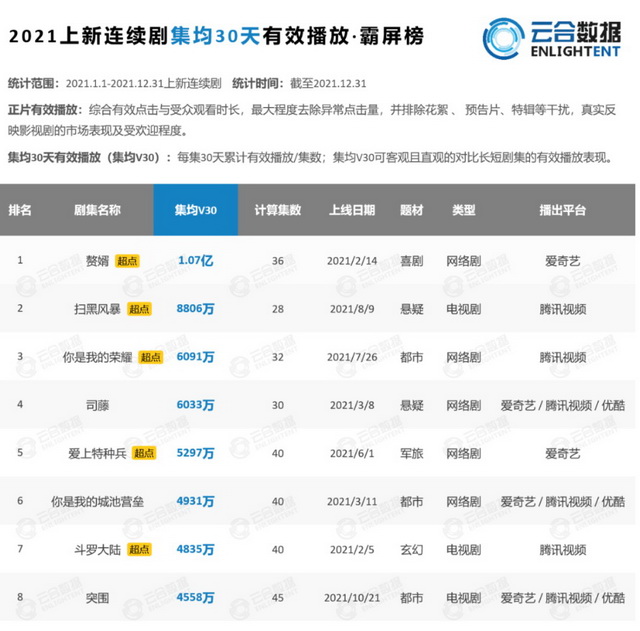 新丽传媒在2021年不乏爆款剧集作品,在云合数据统计的集均有效播放TOP10中,《赘婿》以唯一一部单集过亿的播放量位居榜首,《斗罗大陆》则排在第七——两部作品均改编自阅文旗下IP。谍战剧《叛逆者》则成了去年的8分口碑作。