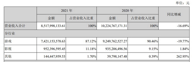 完美世界的影视剧业务收入占比的提升,则并非一个好的信号。虽然2021年其影视业务收入达9.52亿,占总营收的11.18%,较去年有小幅提升,但考虑到其游戏业务收入从92.49亿降至74.31亿,影视业务收入占比同比其实有所减少。
