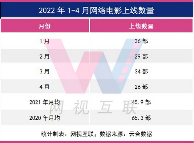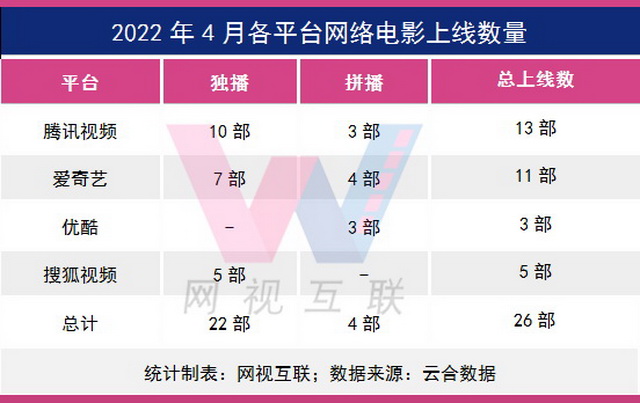 据云合数据提供给网视互联的独家数据显示,2022年4月爱奇艺、优酷、腾讯视频、搜狐视频等视频平台共上线网络电影共计26部。