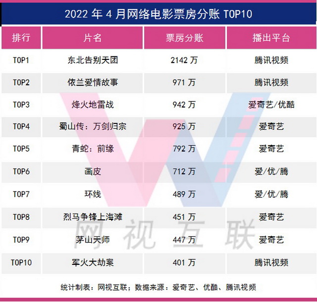 网视互联(ID:wxs360)根据爱奇艺、优酷、腾讯视频、云合数据、猫眼专业版APP等公布的相关票房,整理出了全网网络电影票房分账榜TOP10。