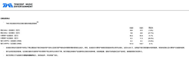 用户数方面,腾讯音乐的在线音乐移动月活用户数为6.04亿,较去年同期的6.15亿,同比下降1.8%,社交娱乐月活用户数为1.62亿,较去年同期的2.24亿,同比下降27.7%。