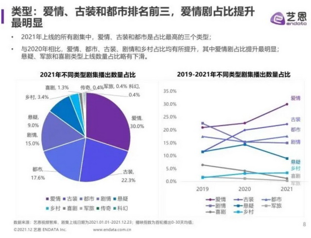 根据艺恩数据,2021年播出的剧集当中,爱情、古装和都市类型分别占据30%、22.5%和17.6%,即便不算后两者的大量交叉,爱情也是剧集市场的第一主题,能够获得观众喜爱。