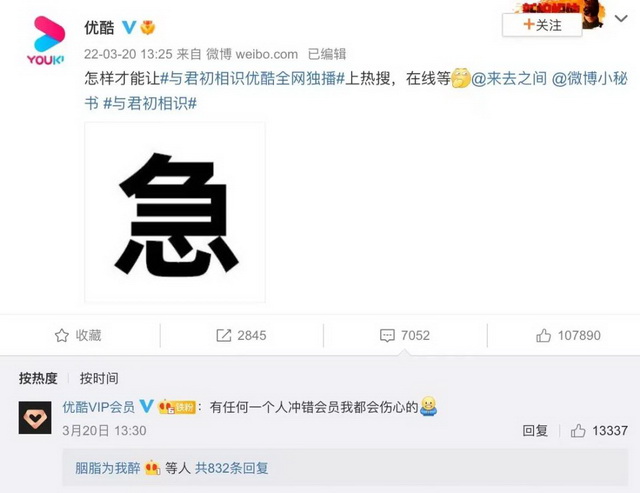 一个有趣的现象是,在各大平台当中,优酷的官方社交账号也最为活跃。常以“裤裤子”自称的优酷官博,常常因有趣甚至傲娇登上微博热搜。