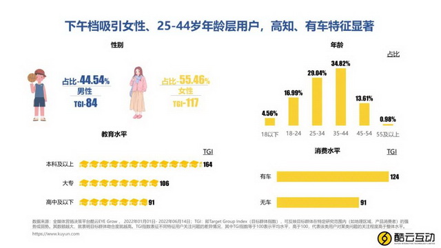 酷云互动合伙人兼副总裁吕海媛告诉毒眸,一般剧集晚黄时段是一轮剧、二轮剧首播时段,而白天档剧集都是重播剧,从不同时段高收视表现的剧集类型来看,上午档、晚黄档获得高收视的剧集类型更加多元化,下午档较为单一。剧集类型的集中也带来了用户类型的集中,形成稳定的收视用户群体,可以满足不同广告主的传播需求。