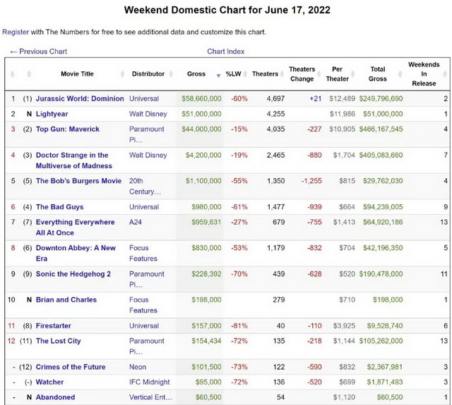 值得一提的是,包含《光年正传》在内前三名的收益均超过4千万美元,为2013年第25周后首次达成,彼时榜单由《怪兽大学》、《僵尸世界大战》和《超人:钢铁之躯》领衔。此外,这一情形也仅在2009年12月和2005年5月出现过,足见当下市场中头部影片的号召力。