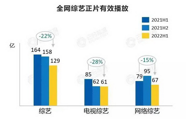 云合数据《2022H1综艺网播表现及用户分析报告》,在开篇的概览直接点出,上半年综艺“爆款缺位”,全网综艺累计正片有效播放129亿,同比缩减22%。其中,电视综艺有效播放61亿,同比下滑28%;网络综艺有效播放67亿,同比下滑15%。