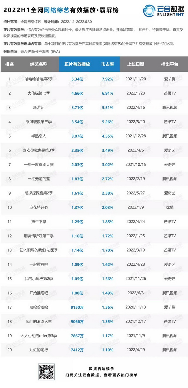 云合数据显示,今年上半年各视频平台的有效播放同比下滑一至四成,台综有效播放霸屏榜TOP1是《王牌对王牌7》(11.34亿),而去年的榜首《王牌对王牌6》有17.84亿有效播放;而去年的网综第一是揽获8.19亿有效播放的《青春有你3》,但今年的榜首《哈哈哈哈哈2》“只”收获了5.34亿有效播放。