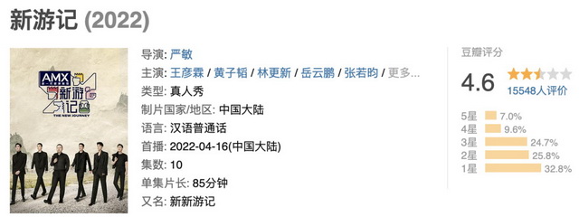 灯塔专业版数据显示,严敏操刀的《新游记》是今年上半年正片播放表现TOP1,但节目的豆瓣评分仅有4.6分,至少在整体口碑上,没能成功抓住打分群体的喜好。