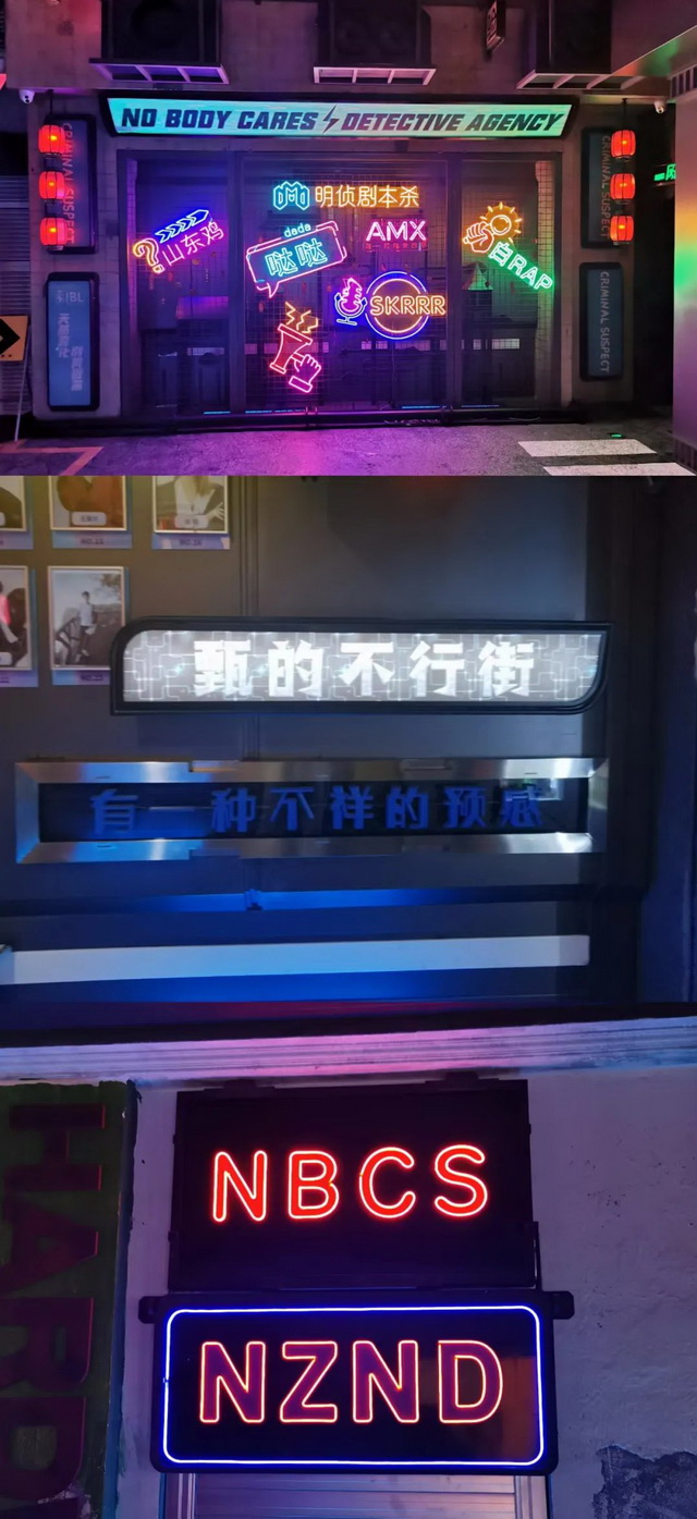 M-CITY长沙店的装修是赛博朋克风的,店内布景的《明侦》元素充分。到处可见的“甄的不行街”“哒哒”等灯牌,配上店内循环播放的节目插曲,会让来打卡的明侦老粉瞬间穿越到节目现场。MOMO指着店里的黑色笼子告诉我们,“连这个铁笼都是直接从节目组搬来的,就是白敬亭咬过的那个笼子。”