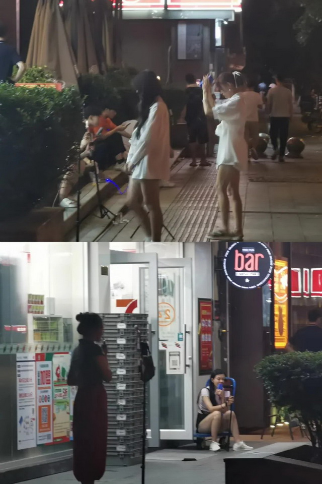那天半夜,我们顺着黄兴广场逛了一圈,看到仅主街道就有大致20位正在直播的主播。“条件”好一点的,会在手机镜头前摆一个专业的直播灯;差一点的,就坐在连路灯都没有的马路边。