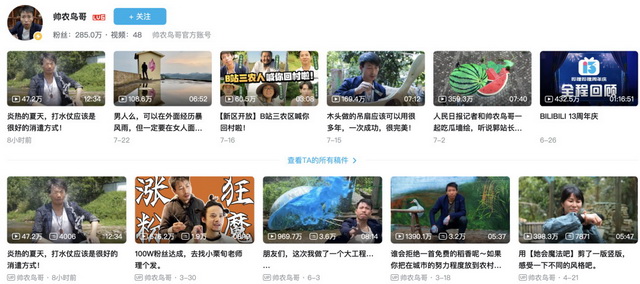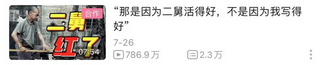 在B站,“回村三天,二舅治好了我的精神内耗”上传7天,播放量已经超3600万。UP主衣戈猜想本来今年的目标是粉丝破百万,但如今他的粉丝量已经轻松突破250万。