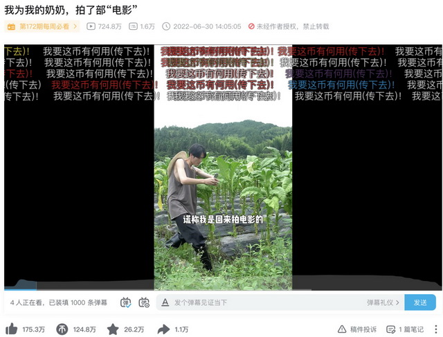 与“二舅”类似的是,UP主“吴木良”在近期上传的视频“我为我的奶奶拍了部电影”也同样在B站大火,播放量达724万。这条视频也很难说有明确的内容定位,但同样凭借视频中让人感动的情绪在站内爆发,甚至满足了UP主让奶奶上电视的梦想。在此之前,UP主的主要视频内容,是做一些乡村手工。