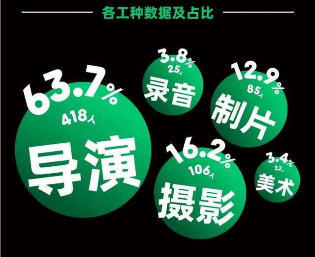 FIRST训练营办了11年,但前9年都是属于导演的训练营,从去年开始才形成了五个岗位分别选拔的团队创作模式。在报名的创作者中,仍然是导演占比最多,达到了63.7%,美术与录音占比相对较少,共计7.2%,和去年情况十分接近。