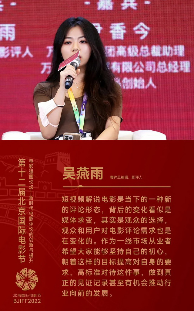 毒眸总编辑吴燕雨分享了从传统媒体到公众号、再到短视频时代,从事评论工作的一些实践经验。以短视频解说而例,《独行月球》上映期间,“毒舌电影”抖音号将解说重点放在了演员沈腾的表演、喜剧演员的内核和孤独感等主题上。这些内容依赖视频形式,能给予观者直接的影像感受与冲击力,是看听感一体的,这是文字影评所难以带来的。