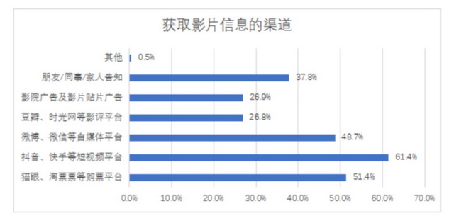 据《2021中国电影观众调查报告》显示,从豆瓣、时光网等影评平台获取影片信息的观众仅占26.8%,更多的观众选择的是短视频平台、自媒体平台或熟人关系网告知。