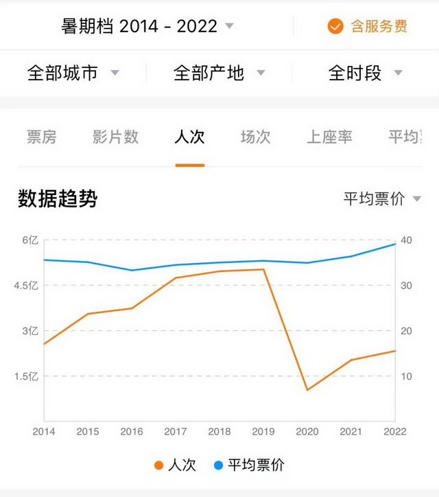 更值得注意的是,这91.34亿又一次建立在历史同档期最高票价的基础上。去年暑期档36.37元的平均票价已经刷新纪录,在这之前的2018、2019年暑期档平均票价分别为35.01元和35.39元,但如今这个数字已经升至39.1——高票价助推的票房成绩背后,观影人次的流失已经成了无法被掩盖的事实。