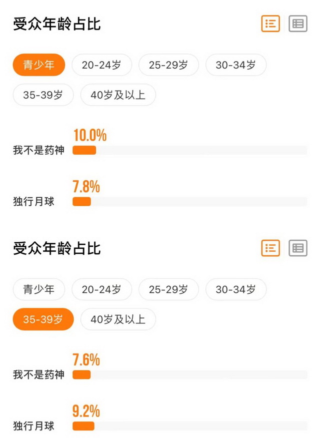 不止于此,以2018年档期票房最高的《我不是药神》和今年的《独行月球》作为案例,灯塔专业版显示,前者的青少年用户占比为10%,后者只有7.8%,在20-29岁的观众占比上,前者也要远高于后者,而《独行月球》30-39岁的观众占比则高于《我不是药神》——