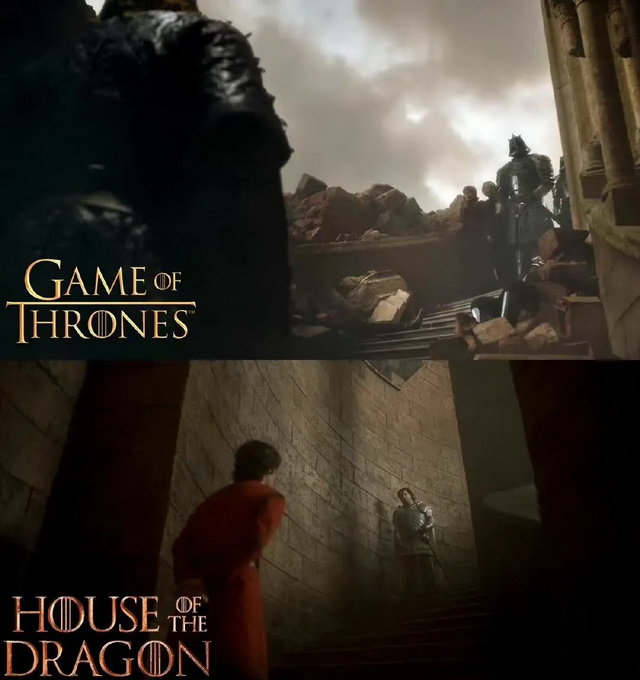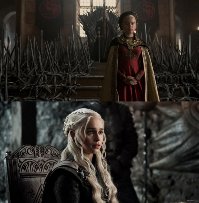 《龙之家族》角色雷妮拉·坦格利安公主的初登场是在一条巨龙前向着镜头回眸,在她转过身前,几乎一样的发型、衣装、场景会让老观众自然联想到《权力的游戏》主角之一丹妮莉丝·坦格利安。这既是导演的一次有意致敬,也是衍生剧和母剧密切关系的缩影。