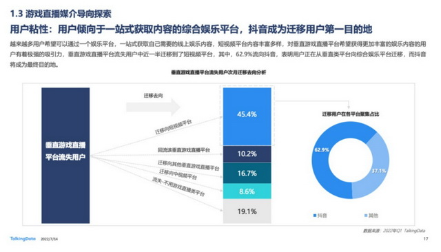 据TalkingData《2022年中国游戏直播行业白皮书》显示,游戏直播用户倾向于一站式获取内容的综合娱乐平台,在垂直游戏直播平台流失用户中有45.4%的人迁移向了短视频平台,19.1%的人不用游戏直播类平台。
