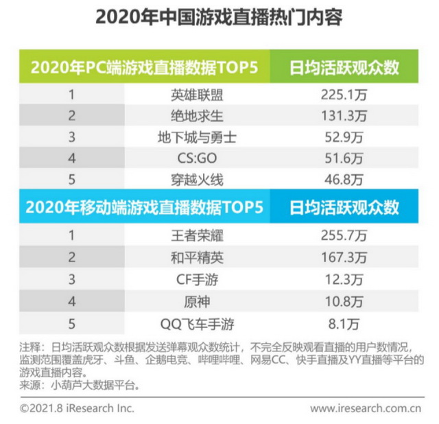 报告显示,移动端游戏直播数据TOP5的游戏,平均上线时长已经达到4.8年,而PC端游戏更是甚至达到了11年。