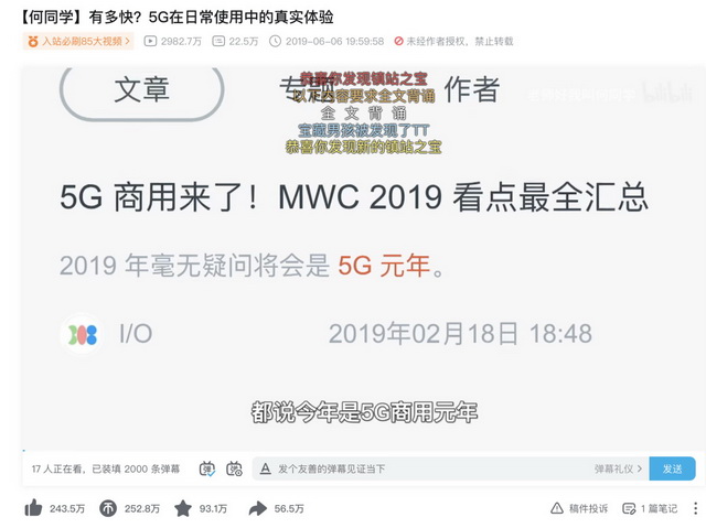 2019年6月6日,何同学的一条介绍5G的视频爆火,该视频较为翔实,同时带有比较酷炫的剪辑和特效。更关键的是,那一年,5G正有成为未来风口的趋势,是各方关注的焦点。因此,尽管很难说有什么实质性内容,但那条视频还是得到了央媒的注意,在人民日报等媒体相继转发后,何同学作为北邮高材生的身份被坐实,他彻底火了。