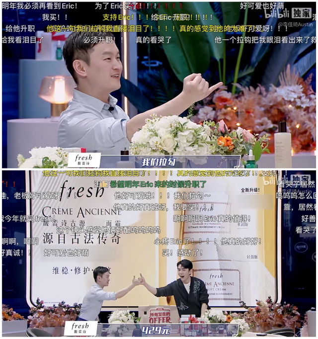 另一方面,作为双十一的预热,《所有女生的offer》对于激发消费者购买欲的作用,并不是最核心的因素。馥蕾诗的Eric因为被砍价到双眼含泪成为了这个节目里为数不多让人记住名字的品牌方代表,观众纷纷留言表示心疼,还让李佳琦在直播间醋意大发“你们爱谁呀”,但并不影响预售当晚面膜没能卖完。