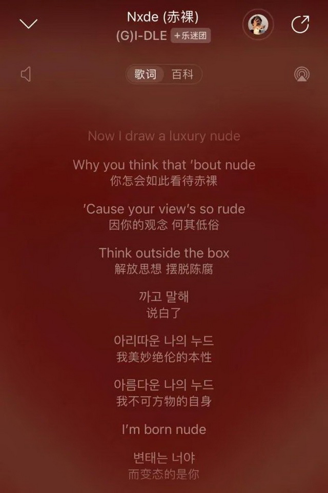 值得一提的是,因为(G)I-DLE的团名源自韩语的“女孩子们”,主打名为“Nude”,在韩网搜索相关的色情话题时,得到的搜索结果会是本次主打歌的新闻通稿,形成了和朴赞郁的《小姐》一样达到“清理词条”效果的网络奇观。