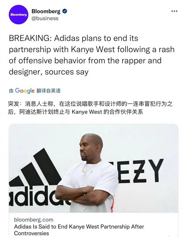 接二连三输出“犹太人阴谋论”,让Kanye面临着远比““WHITE LIVES MATTER”严重的后果。几天之后,kanye公开表示,他在一天之内损失了20亿美元。包括阿迪达斯在内的合作品牌纷纷宣布割席,经纪公司也宣布暂停合作,他的巡演、纪录片企划都宣布中止,整个演艺工作处于停摆状态。