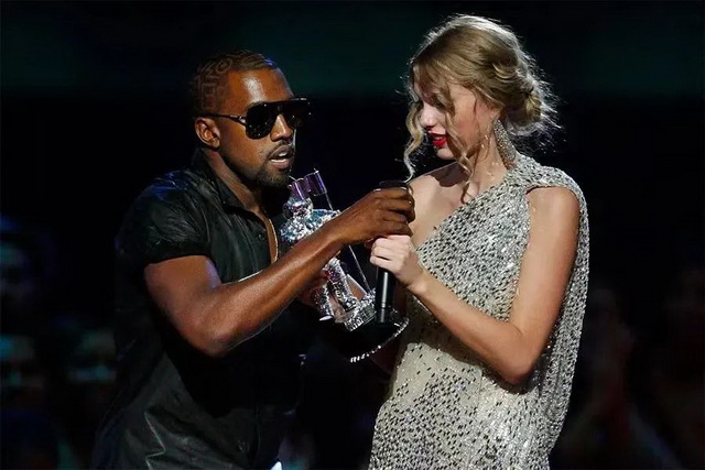 2009年的VMA颁奖礼上,19岁的泰勒·斯威夫特上台领取当年的“年度最佳MV” 大奖。坐在第一排,此前走红毯时提着一瓶750ml的轩尼诗的Kanye突然冲到了台上,抢过了泰勒·斯威夫特的麦克风说“Beyonce的MV是史上最牛X的MV。”