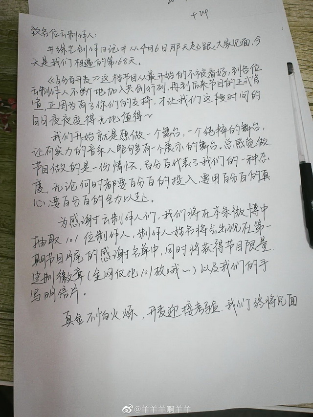 9月19日,《百分百开麦》正式官宣。羊羊在个人微博上,发布了一封手写信,在信里感谢了“云制作人”们。