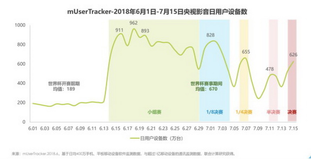 以2018年世界杯为例,当时的央视影音是用户观看比赛的主要渠道。据mUserTracker监测数据显示,在比赛初开时期,央视影音日用户设备数大幅增长,开赛3天突破900万,峰值直逼千万级别。