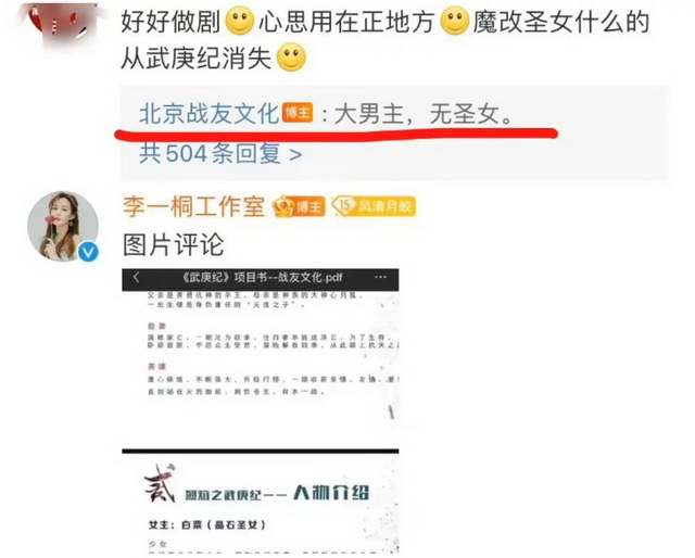 上周,网剧《烈焰之武庚纪》的制作方下场回复粉丝,称剧集是“大男主”,没有网传要加的“圣女”一角,官宣微博也只写了“领衔主演”男主任嘉伦的名字;此事一出,原定的女主李一桐直接宣布辞演,工作室晒出项目书中有“圣女”的角色,并在声明微博中表示:“对于制作方的宣传方式和节奏,我们毫不知情,也未收到任何告知。”