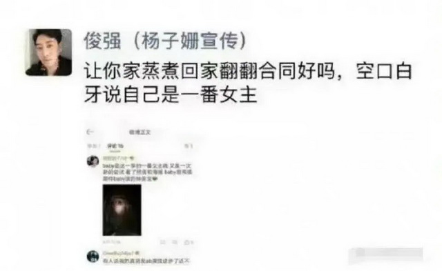 现实生活中,也有艺人团队亲自下场。《摩天大楼》播出前期,杨颖粉丝对外宣传“一番大女主”,就被正牌女主杨子姗的宣传在朋友圈内涵:“让你家蒸煮(正主)回家翻翻合同好吗,空口白牙说自己是一番女主。”