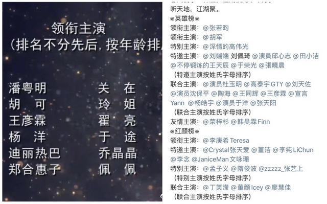 而具体到剧方,他们解决“撕番”问题的方式一般有两种:一是制造更多“主演”,《雪中悍刀行》官宣时,就一口气列出了领衔主演、特别主演、特邀主演、联合主演等多个称号,还分了“英雄榜”和“红颜榜”,把男女演员直接分开;二是在对外宣传时采用按照姓氏和笔画来为演员排序,《你是我的荣耀》也把杨洋放在迪丽热巴前面,并标明了“按年龄排序”,以模糊番位之争。