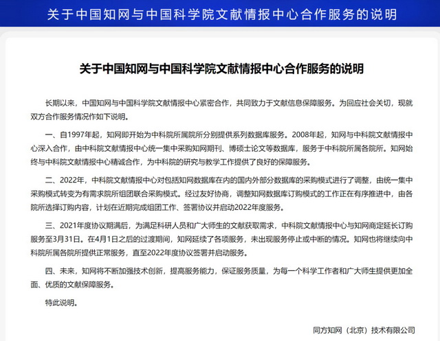 近期中国科学院文献情报中心称,从4月20日起停用CNKI数据库,该通告表示:“2021年,中科院集团CNKI数据库订购总费用达到千万级别,该数据库高昂的订购费用已成为中科院集团资源引进中的‘巨无霸’”。消息很快被媒体证实,被问及是否会恢复对知网的访问时,受访的负责人表示“至少今年没有这个计划”。