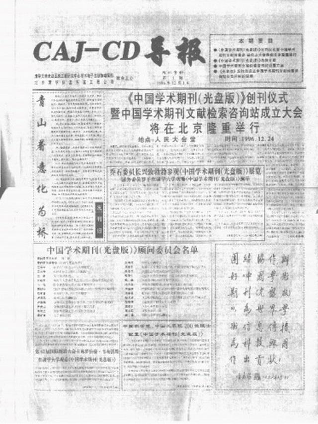 知网诞生的本意,是让学术知识的分享和查询变得更加容易。“为世界学术信息传播作出贡献!”1996年的第1期《CAJ-CD导报》上,时任全国人大常委会副委员长的卢嘉锡写下了这番寄语。