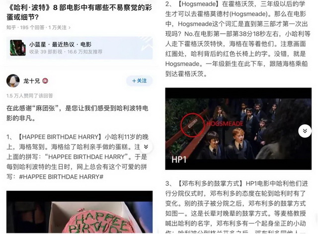这些固定问法在知乎由来已久。去年知乎创立十周年时官方策划了“十年百问”盘点,2011年的十大提问中就有一条“《哈利·波特》8部电影中有哪些不易察觉的彩蛋或细节”,一个收获1.5万赞的回答图文并茂地列举了系列电影中106个细节,而另一个收获9千赞的回答则主要分享了一件事:原著《混血王子》中用两三页篇幅描写了哈利·波特一行人来到弗雷德和乔治开的“魔法商店”,电影为呈现80秒的镜头,15名设计师耗时1年,设计了40000份海报、玩具和包装盒。