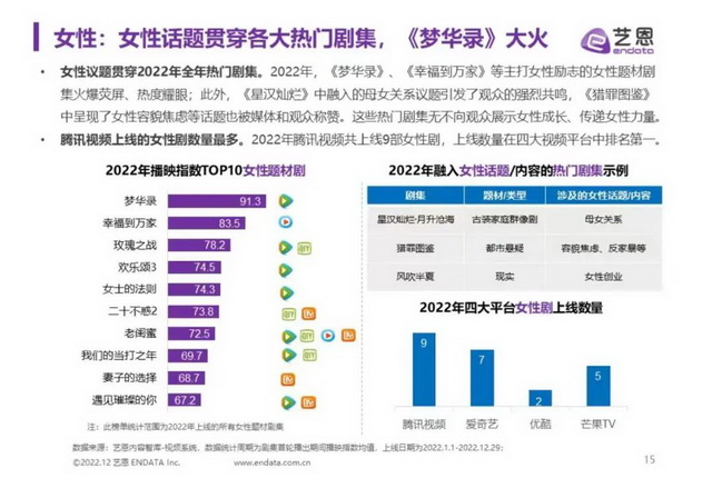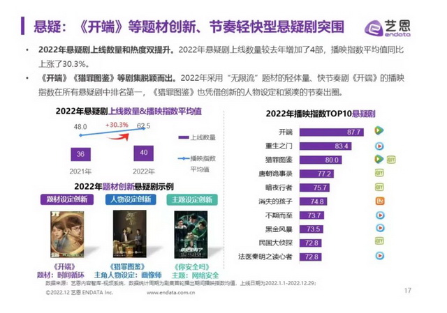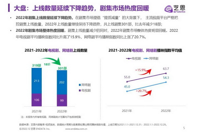 例如,根据艺恩数据,2022年剧集上线数量延续了下降趋势,在主流视频平台对剧集上线数量的严格把控之下,2022年共上线剧集301部,比上一年减少了18部;但与此同时,2022年电视剧平均播映指数同比升高了15.9%,网络剧平均播映指数更是同比增长了20.7%.