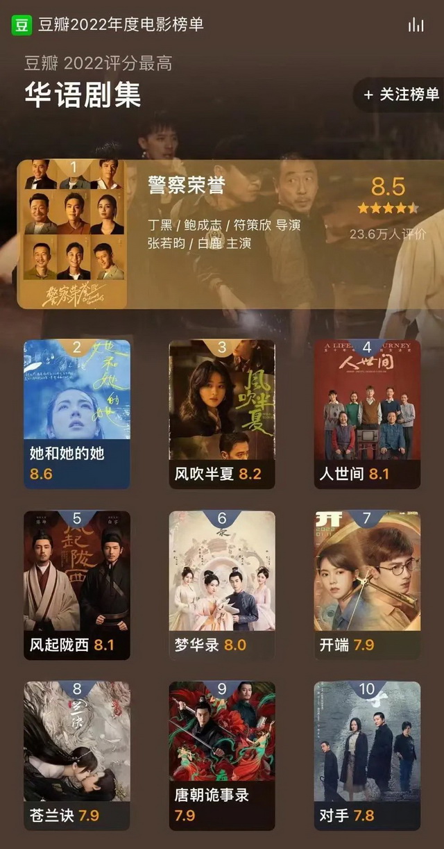 简单的数据罗列有,爱奇艺这一年有5部剧集热度破万(此前总共2部),豆瓣今年“评分最高华语剧集”榜单,前10当中爱奇艺占据7席,全年一共有23部剧的评分在7分以上。