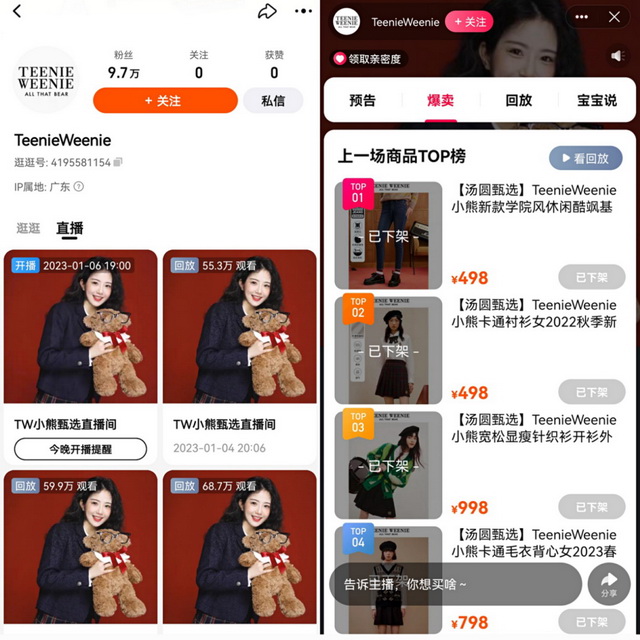 记者了解到,D#39;zzit甄选直播间从0粉纯新号开播1个月,单月就破千万销售;TeenieWeenie甄选直播间,12月1日首播,从0粉纯新号开播12天,单日场观人数即破百万。