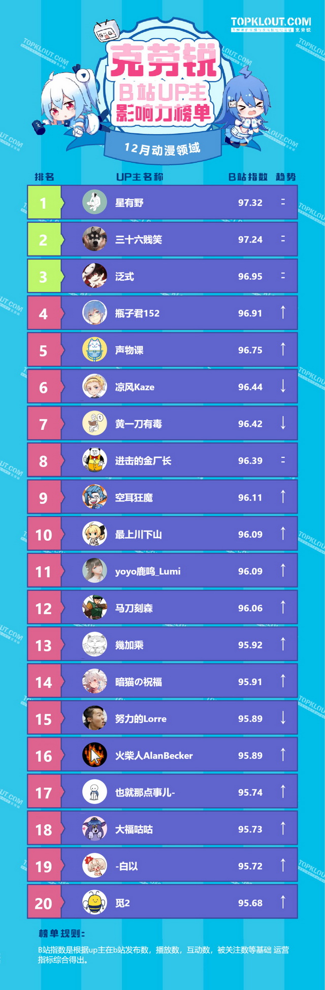 各垂类头部UP主排名依据的是“B站指数”。B站指数是根据每位UP主的内容发布量、播放量、转发量、评论量、收藏量、点赞量、关注量共七个维度综合计算得出的,是客观反映UP主的影响力及营销价值的重要指标。我们来一起看看12月榜单吧!